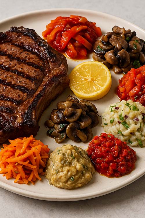 אנטריקוט על האש כמו שחלמתם – עסיסי, חרוך בדיוק, מוקף בסלטים מזרחיים שמרימים כל ביס.