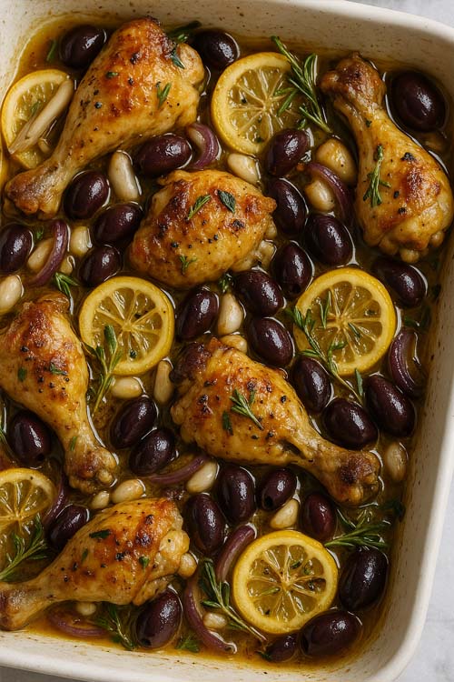 שוקי עוף עסיסיים שיוצאים מהתנור זהובים, רכים, ונושאים איתם רוטב עשיר של זיתים מיוחדים, בצל סגול, עשבי תיבול ולימון.